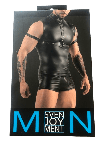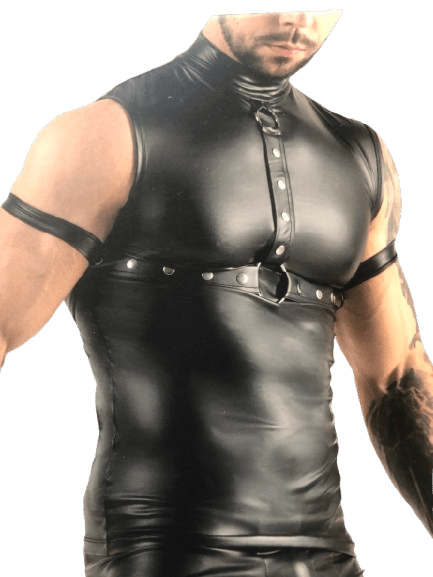 Fræk wetlook shirt med harness og armlænker i sort fra Svenjoyment bondage. og med nitter (ikke aftageligt) På siderne sidder der ringe hvor armlænkerne kan fastgøres. Du kan også vælge ikke at bruge dem. Armlænkerne er også i det flotte mat skinnende wetlook og kan justeres i størrelse via velcrolukninger.